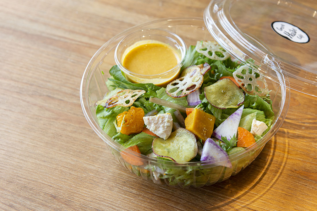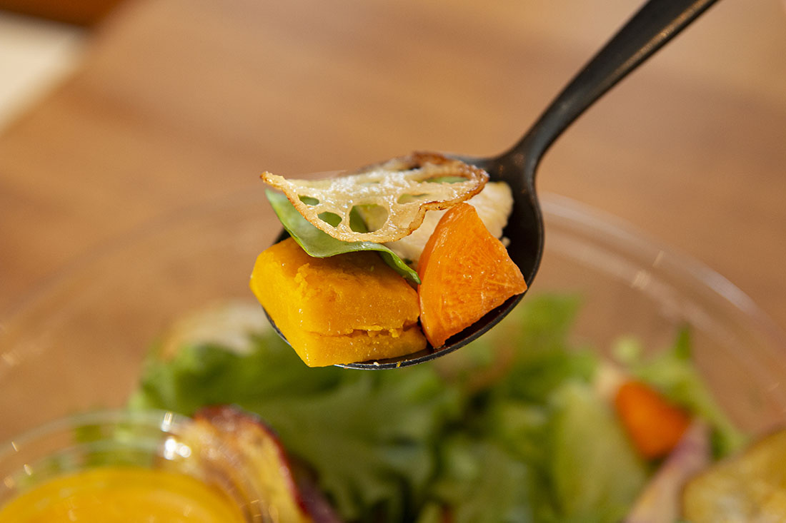 そんなサラダに冬季限定の新作「KONSAI ―根彩―」が登場しました! ネーミングの通り、秋から冬にかけて旬を迎える根菜がふんだんに使われています。根菜類にはカラダを温める作用もありますので、これからの時期にピッタリですね。