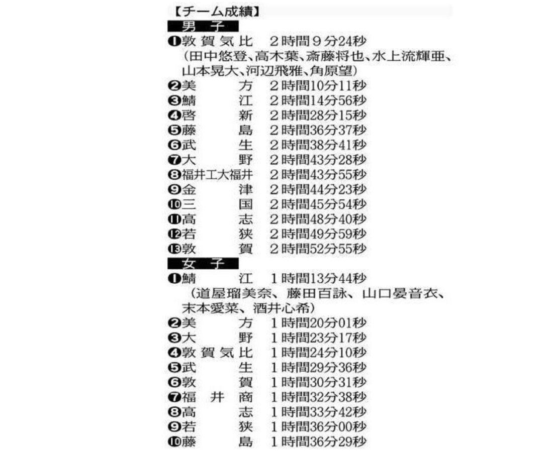 県高校駅伝競走大会は一日、鯖江市東公園陸上競技場を発着点とするコースで開かれた。男子(7区間42・195キロ)は敦賀気比が二年連続二回目の優勝を果たし、女子(5区間21・0975キロ)は鯖江が二年連続六回目の頂点に立った。両校は十二月二十日に京都市で行われる全国高校駅伝(都大路)への出場権を得た。新型コロナウイルスの影響で、北信越大会は中止が決まっている。