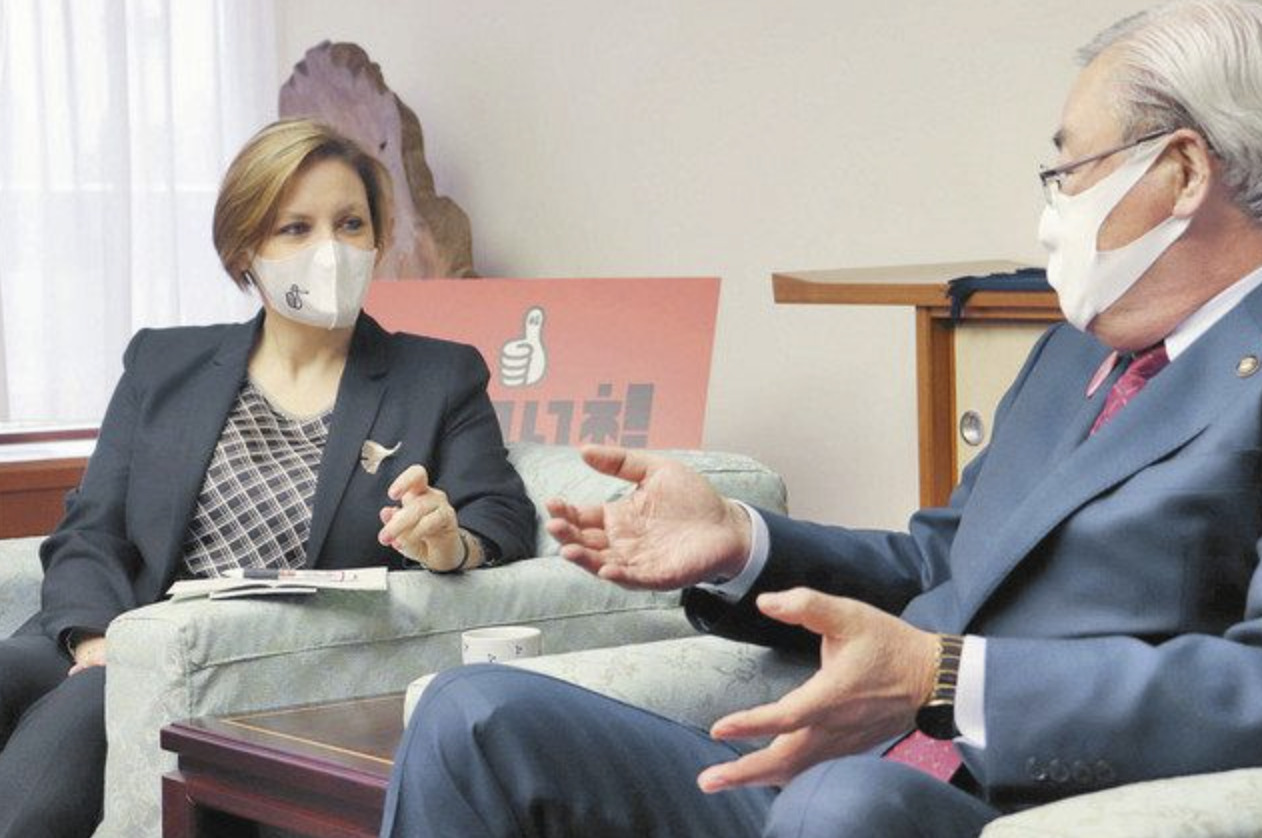 東村市長(右)と懇談するペトリッチ大使=福井市役所で