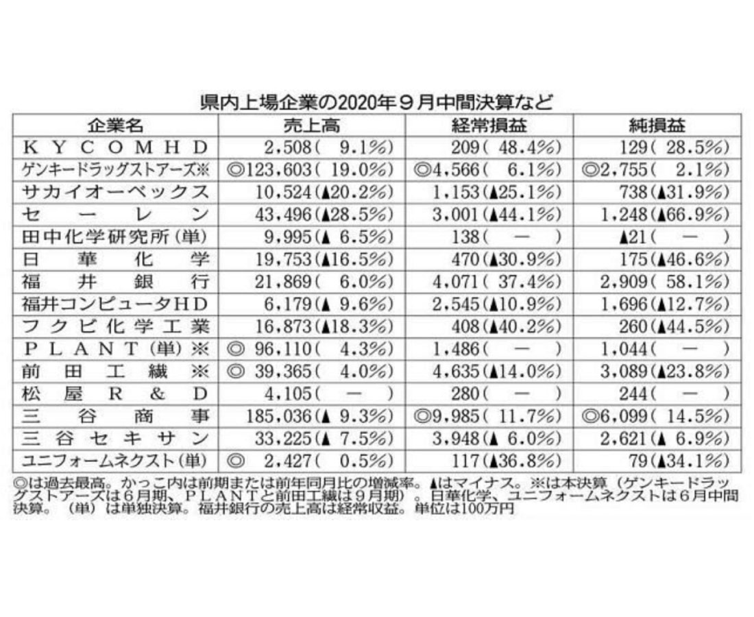 県内上場企業十社の二〇二〇年九月中間決算(四〜九月期)が出そろった。決算期が異なる五社の中間決算と本決算を含めて新型コロナウイルス感染拡大の影響を受けて半数以上の八社が減収となった。一方で、外出自粛による「巣ごもり・買いだめ需要」や感染対策製品の需要を追い風とする企業もあり、明暗が分かれた。