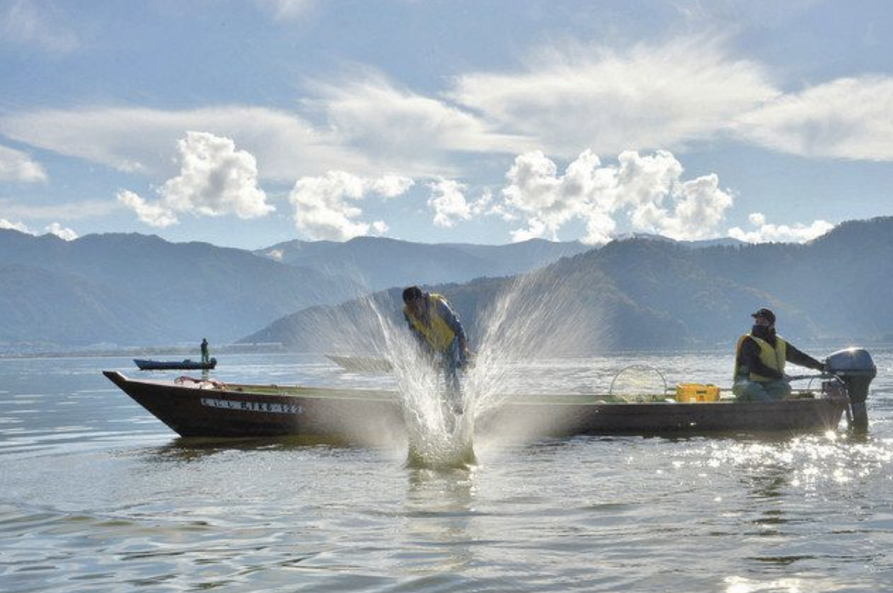 江戸時代から若狭町の三方湖で続く伝統漁法「たたき網漁」が二日、始まった。漁師たちが波の穏やかな湖面に竹ざおを打ち付けると、水しぶきとともに「バシ」と大きな音が響いた。