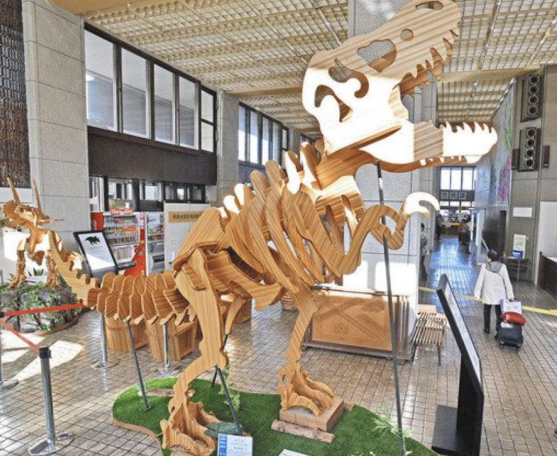 県産材を使った各種製品を集めた「県産材家具建具展示会」が、福井市役所一階市民ホールで開かれている。集成材のパーツを組み立てた巨大な恐竜骨格化石の模型や新型コロナウイルス感染対策の仕切り板など計十四点が展示され、木材の用途の幅広さや温かみをアピールしている。八日まで。