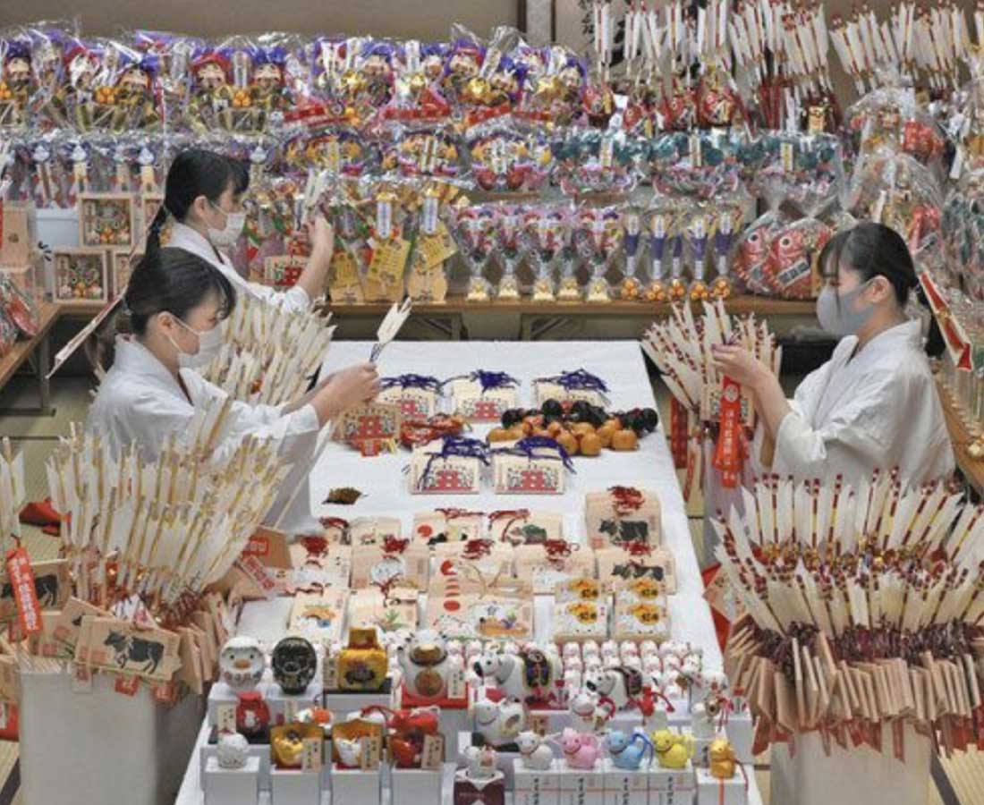 新年に向け、県内各地の神社では初詣客を迎える準備が進んでいる。三が日に毎年約4万人が訪れる福井市大手3の佐佳枝廼社(さかえのやしろ)では、みこらが破魔矢など縁起物作りに精を出している。