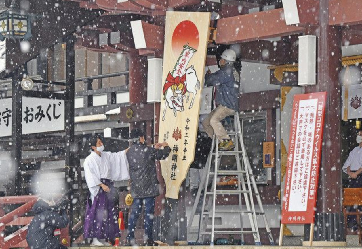 福井市宝永4の神明神社に16日、ジャンボ羽子板が設置された。厄よけの道具として参拝者の厄をはらうため、節分の来年2月2日まで設置する。