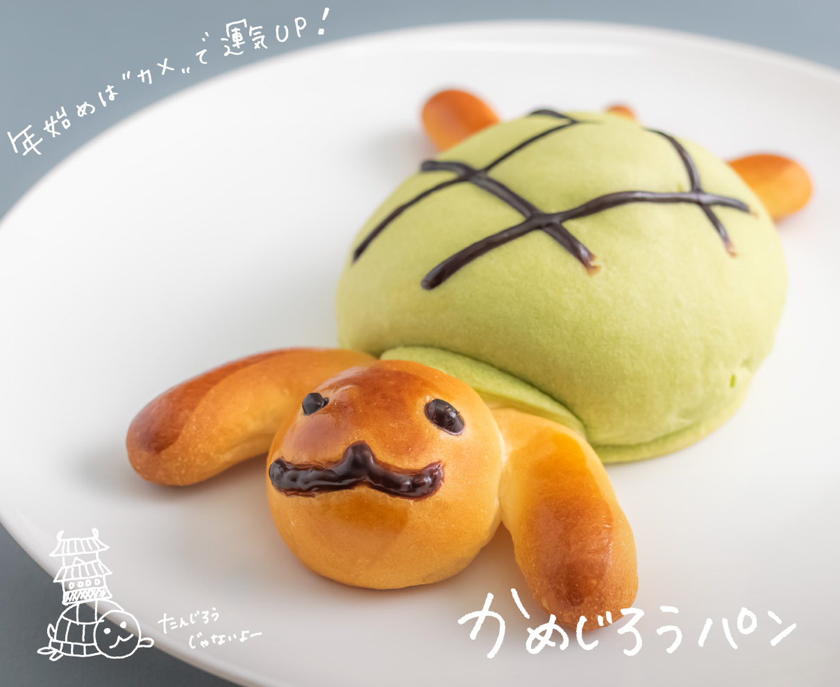 「街のパン屋さん」というフレーズがぴったりの大野市の『清水風月堂』。大正時代から続く老舗では、昔懐かしいパンなど常時80種類ものパンが並びます。市のご当地キャラ「かめじろう」をモチーフにしたこちらは子どもたちからも絶大な人気!