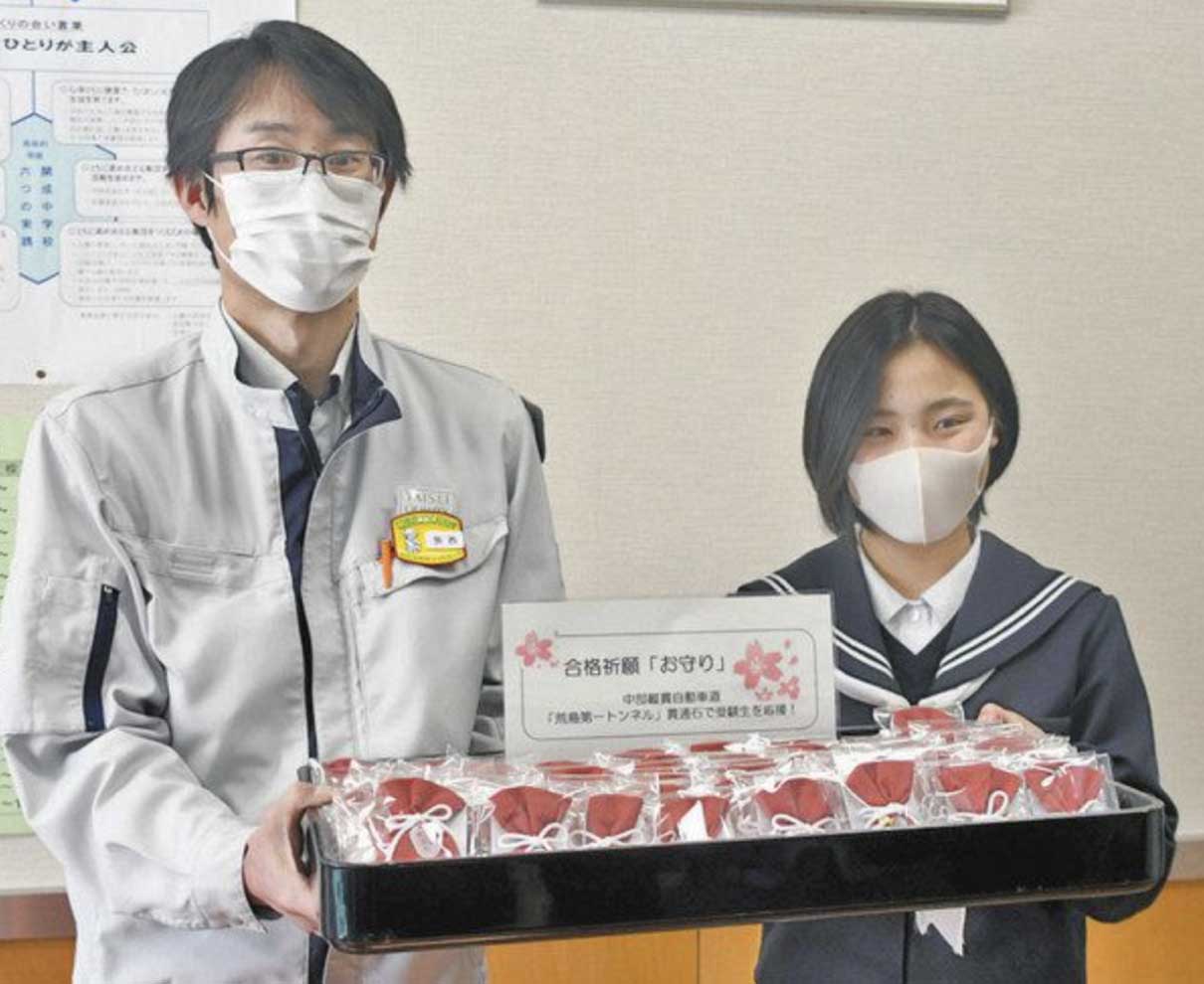中部縦貫自動車道大野油坂道路の荒島第一トンネル(大野市)の掘削工事を担当した大成建設関西支店(大阪市)が二十六日、トンネルの「貫通石」を入れたお守りを大野市内の中学三年生二百七十八人に寄贈した。難関のトンネル工事を突破した証しで、お守りには生徒たちが受験で「難関突破」するようにとの願いが込められている。