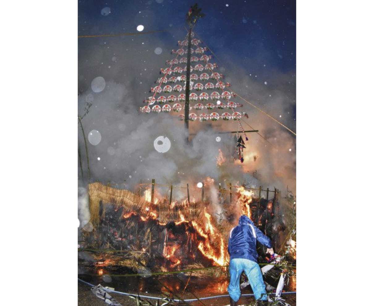 伝統ある黒龍(くろたつ)神社の左義長火祭りが十五日、福井市舟橋町の同神社であった。強い雨の降りしきる中、参加者らは無病息災や疫病消除を願い、燃え盛るどんど焼きの炎を見守った。