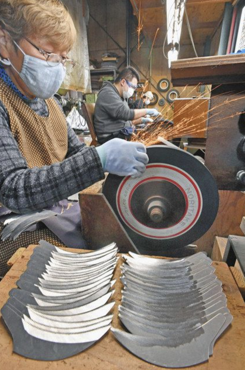 越前市武生柳町のカトウ打刃物製作所で、農作業用鎌の生産が繁忙期を迎え、職人たちが一枚一枚丁寧に切れ味の良い刃を仕上げている。