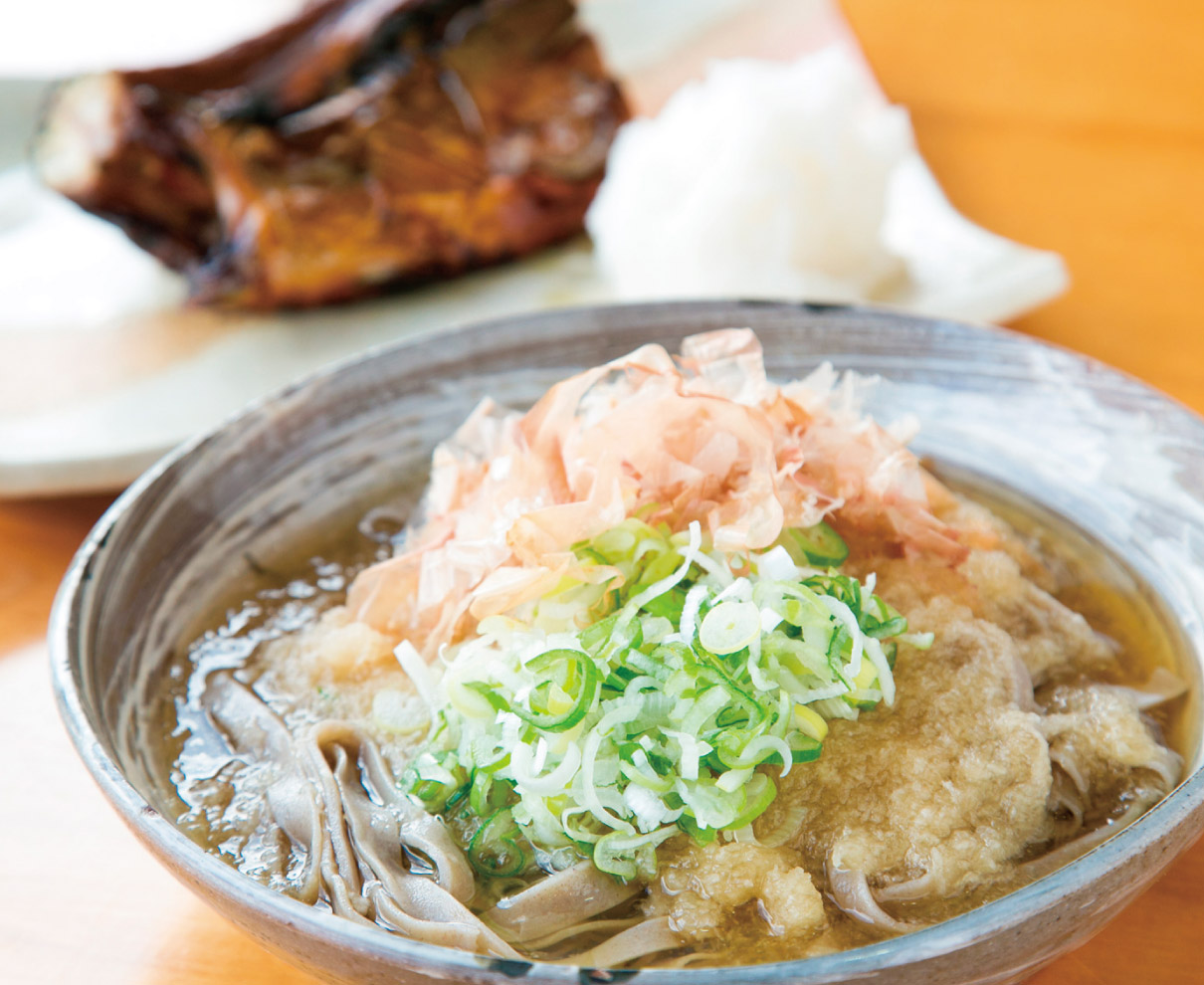 ネギやかつお節がたっぷり盛られた、ぶっかけのおろしの下には完全手打ちの平打ち麺。こちらのそばは太くて薄い、パスタで言うとフィットチーネといったところか。「ラーメンやパスタに慣れている、若い人や子どもにもそばの美味しさを知って欲しい」との思いで『こはく庵』のそばは完成した。こだわりの自家製ダシにしっかりと絡んだそばは、程よいコシとのど越しの良さを楽しめる。
