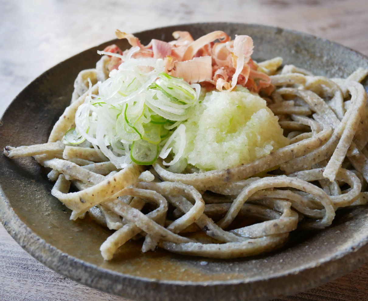 そば殻付きのそばの実・玄そばを石臼で粗挽きに。つなぎを使わず冷水で打ち上げた、手臼粗挽のおろしそばは、噛み締めるほどにそば本来の味と香りが押し寄せ、『谷川』の真骨頂と言える。かつお節も削りたて、3種類をブレンドした大根も出す直前におろす。越前焼の作家による器に盛られた一切ごまかしのない味はいさぎよく、男性はもとより女性の心もつかむ。 「自分が生まれてきた証を残したい」と、45歳の時に決意、脱サラしてそば職人になった店主。その証は、確実に客の舌に“ごまかしのない味”としてあり続ける。