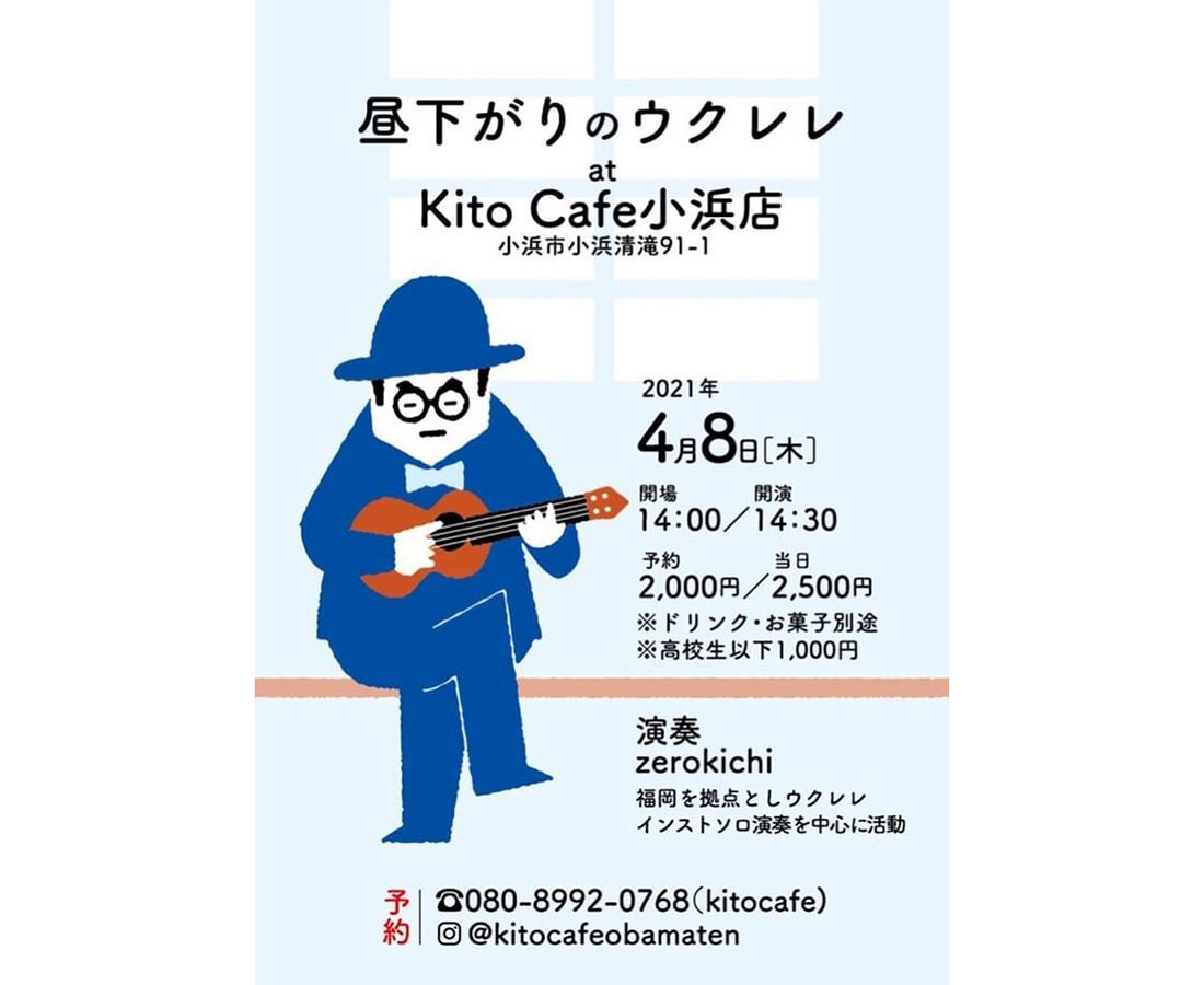 演奏はウクレレを相棒に、カフェ、ギャラリー、美容室、旅館、酒蔵など、小さな会場をステージに、こころ和む素敵な音楽会を全国各地で行なっているウクレレ奏者のzerokichiさん。2020年3月に同店で開催したライブは、ウクレレとバウロンの合奏でしたが、今回はzerokichiさん単独で約1年ぶりに小浜にやってきます。