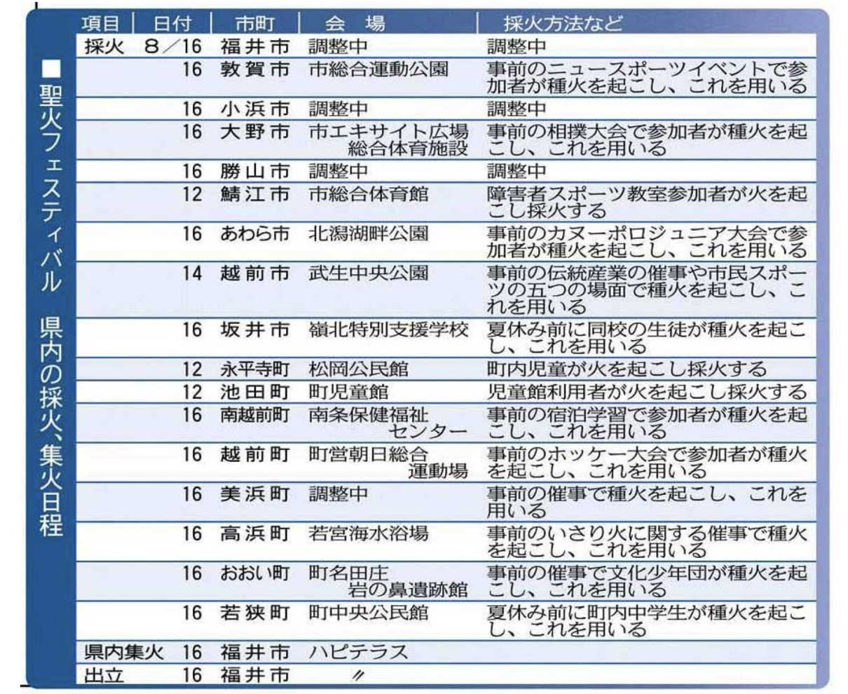 東京パラリンピックに向けて各都道府県で開催される聖火フェスティバルで、県内では八月十二日から十六日にかけて、全十七市町でそれぞれ採火が行われる。同十六日に福井市のハピテラスで各市町から集まった火を一つにする。