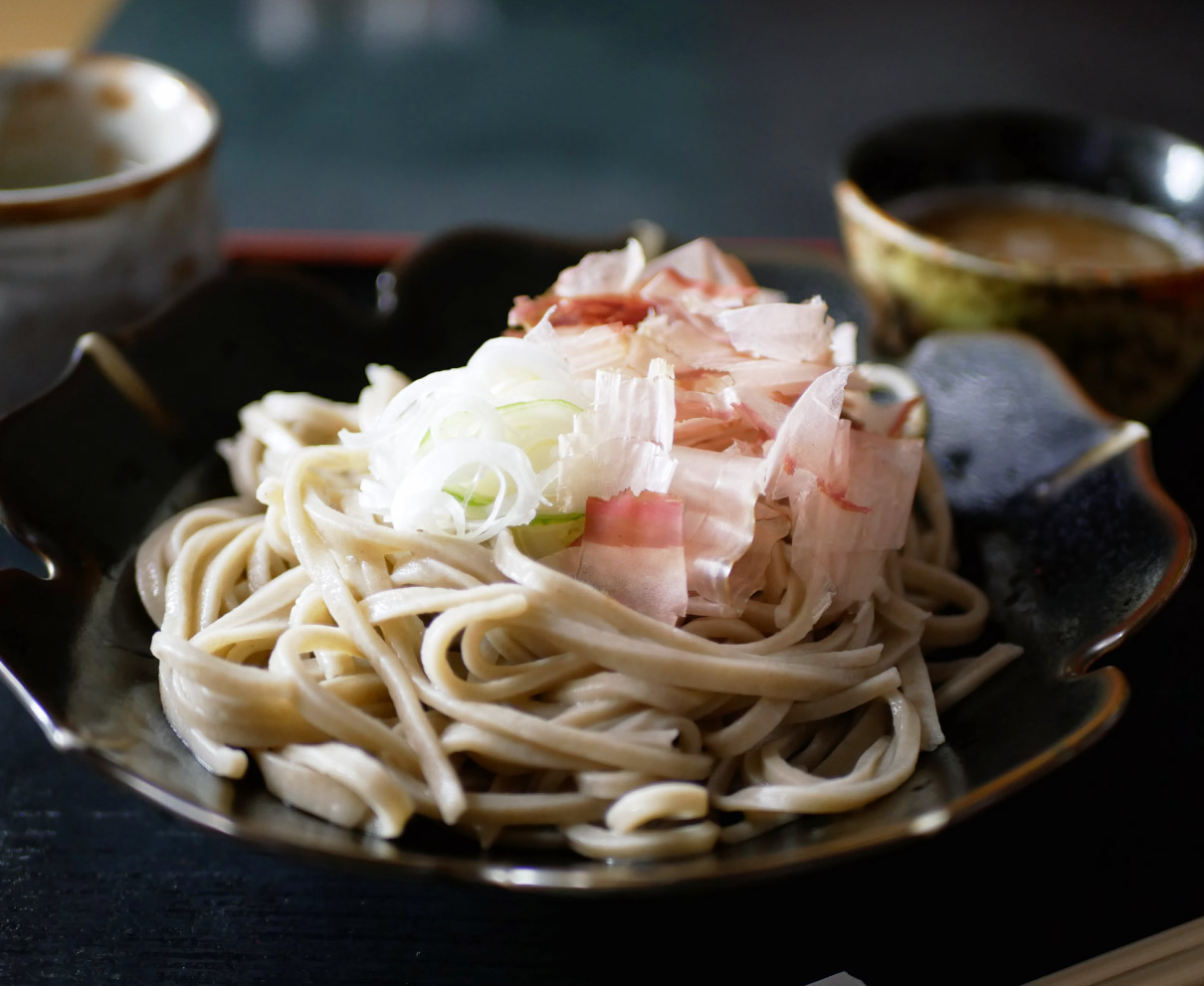 季節によってこだわって選んだ大根のしぼり汁に、合わせるのは生醤油のみ。さっぱりとしたダシですするおろしそばは、ぴんと背筋を正される思いに。毎朝手打ちする二八そばは、やや太め。歯ごたえが心地よいほどにコシがあり、ダシがちょうどよくそばに絡む。