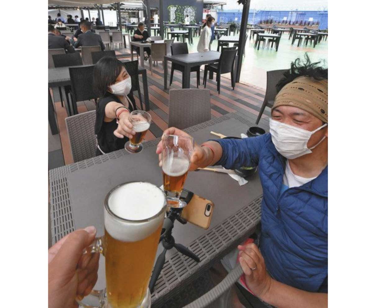 福井市の西武福井店屋上で、ビアガーデン「そらのガーデン」が三日、オープンした。初日は強い風が吹く中、仕事帰りの会社員らが訪れ、マスク姿でジョッキを持ち、静かに乾杯していた。