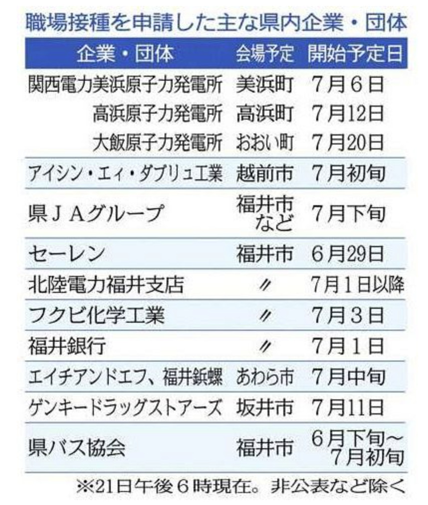新型コロナウイルスワクチンの職場接種が二十一日、全国の大企業などで本格的に始まった。県内では、十五件の企業・団体が国に実施申請して接種の準備を進めている。今月二十九日のセーレン(福井市)を皮切りに順次始まる見込みで、いずれも七月中には一回目の接種に入る。