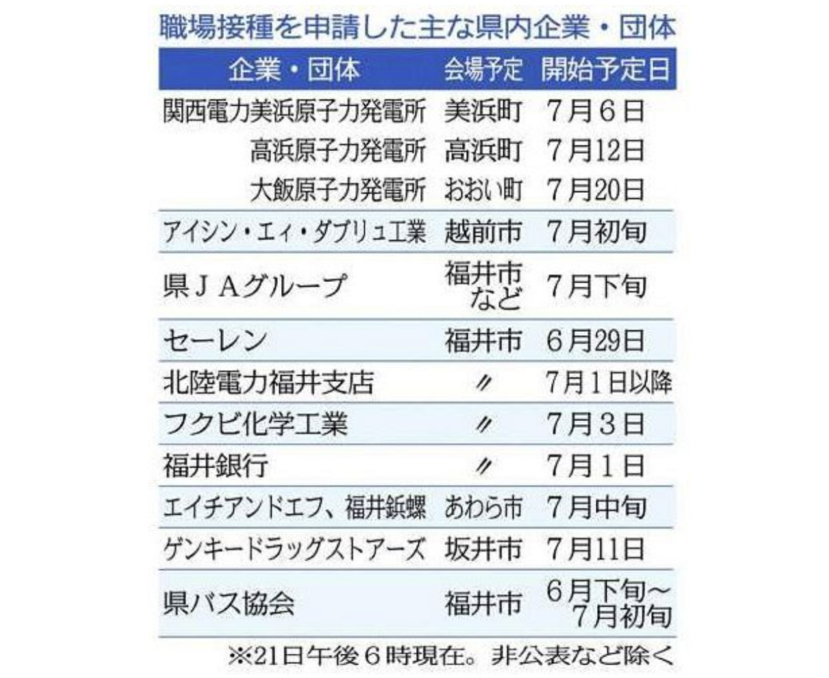 新型コロナウイルスワクチンの職場接種が二十一日、全国の大企業などで本格的に始まった。県内では、十五件の企業・団体が国に実施申請して接種の準備を進めている。今月二十九日のセーレン(福井市)を皮切りに順次始まる見込みで、いずれも七月中には一回目の接種に入る。