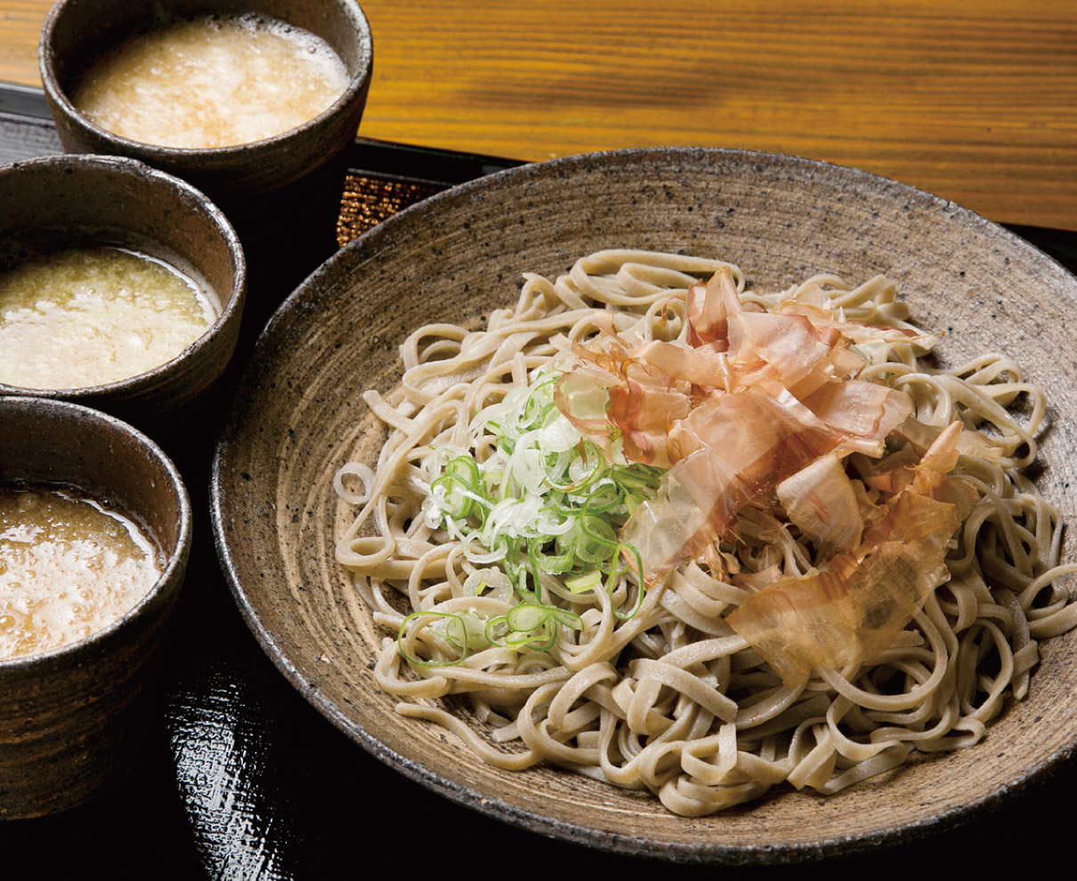 福井駅前に2店舗を構え、観光の際の立ち寄りやおもてなしにも便利な、本格手打ちそばが食べられる店。奥越産そば粉十割で打ったやや幅広の麺は、香りもコシも抜群。一押しの「おろしそば三昧」は、おろし・とろろ・わさびの3種のダシが楽しめるお得なメニューだ。大根おろしのさわやかな風味が楽しめる王道の「おろし」、とろろの旨みが加わり食べごたえがアップする「とろろおろし」、ワサビの鼻に抜ける香りが心地よい「わさびおろし」と、最強の組み合わせで越前おろしそばを味わい尽くして。