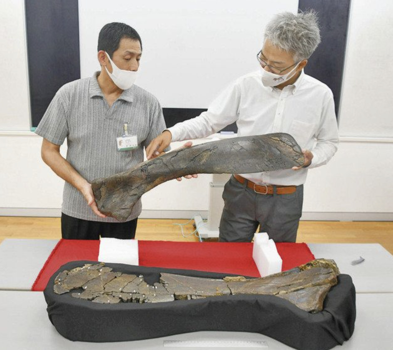 県立恐竜博物館(勝山市)などは十二日、長崎市の長崎半島西海岸にある「三ツ瀬(みつせ)層」から発掘した恐竜化石が、鳥脚類では国内最大級となる草食の鳥脚類ハドロサウルス上科の左肩甲骨化石であることが確認されたと発表した。全長は九メートルと推定される。