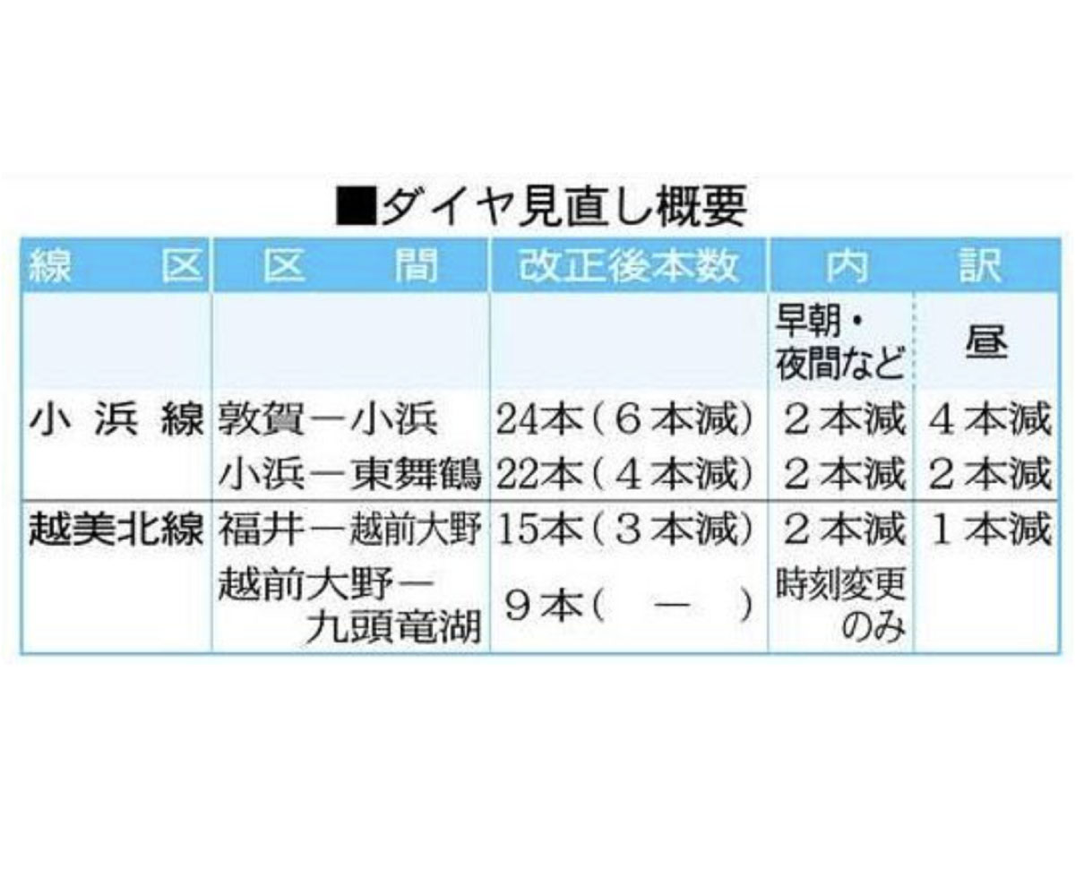 JR西日本金沢支社は二十八日、小浜線と越美北線の運行本数をいずれも二割程度減らす十月二日付のダイヤ改正を発表した。小浜線の敦賀−小浜間は六本、小浜−東舞鶴間は四本、越美北線は三本の減便となる。最終的に九月下旬に確定する。 (今井智文)