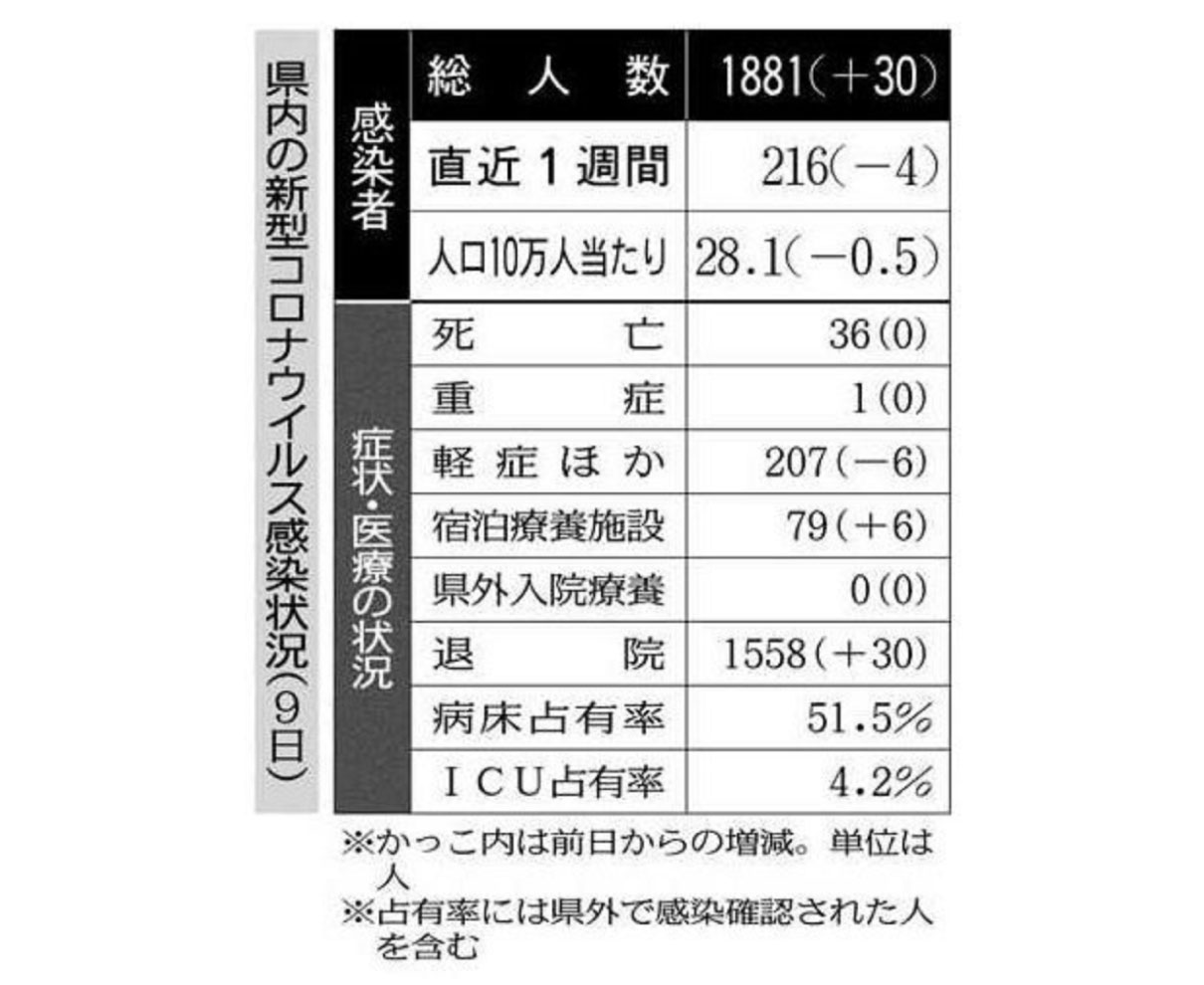 県は九日、新たに十〜六十代の三十人が新型コロナウイルスに感染したと発表した。うち二十九人が県外由来とみられる。県内の感染者は累計千八百八十一人となった。