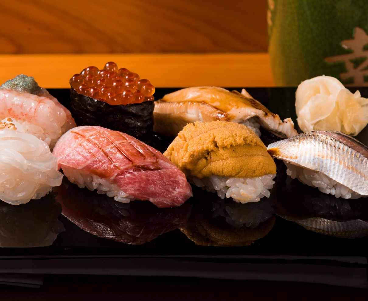 「おまかせ握り(8貫)」5500円は、地のものも取り入れながら、最盛期ならではの旨さを鮨で提供する。