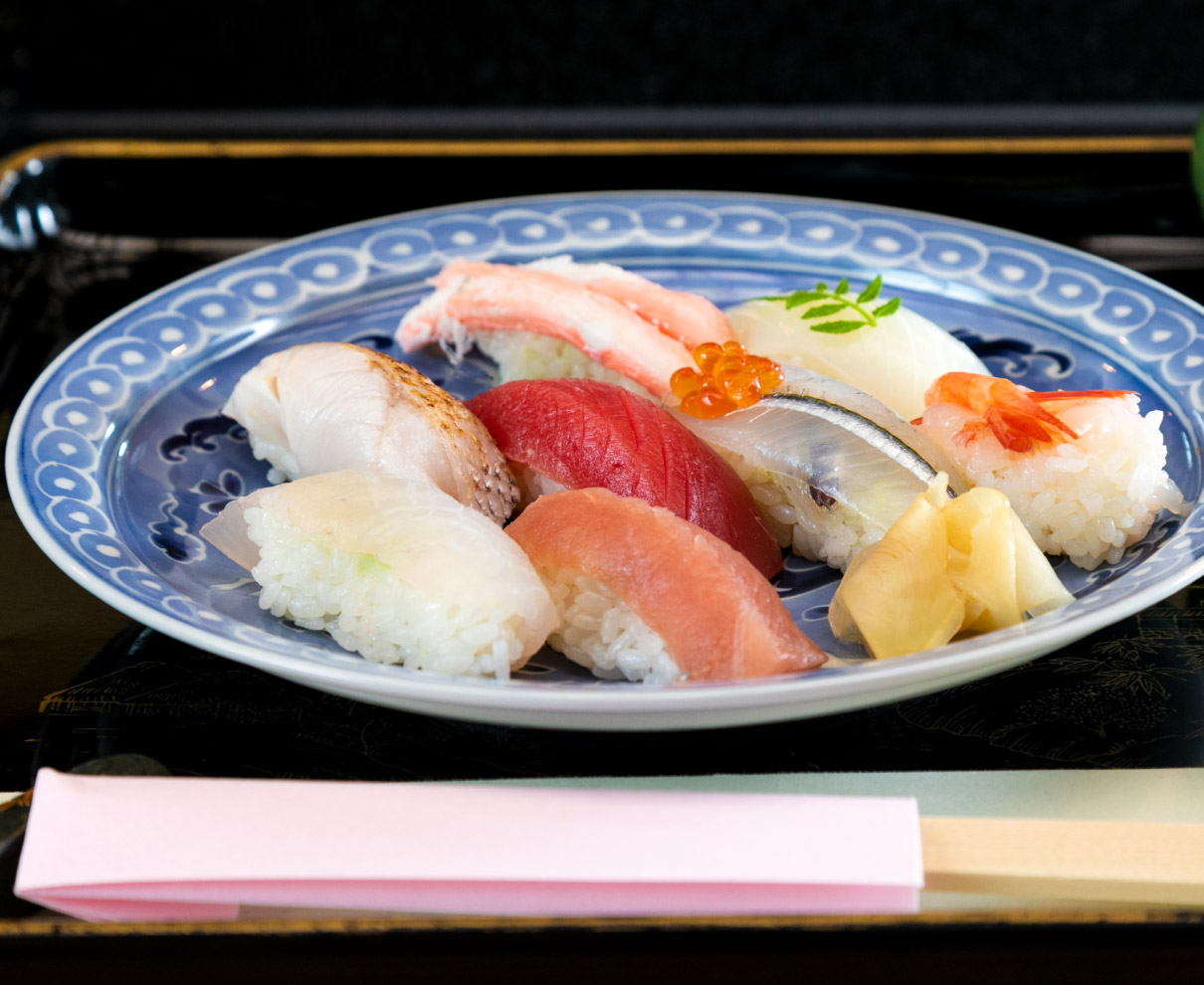 旬のネタを中心としたおすすめ8貫の盛り合わせ「上にぎり」3080円は、フランス人客が気に入ってリピートしたという。特にサヨリの握りが一押しだが、新しいネタの研究にも余念がなく、意欲的な大将の最近のおすすめは「若狭牛ローストビーフの山うにのせ」(前日までの要予約)。