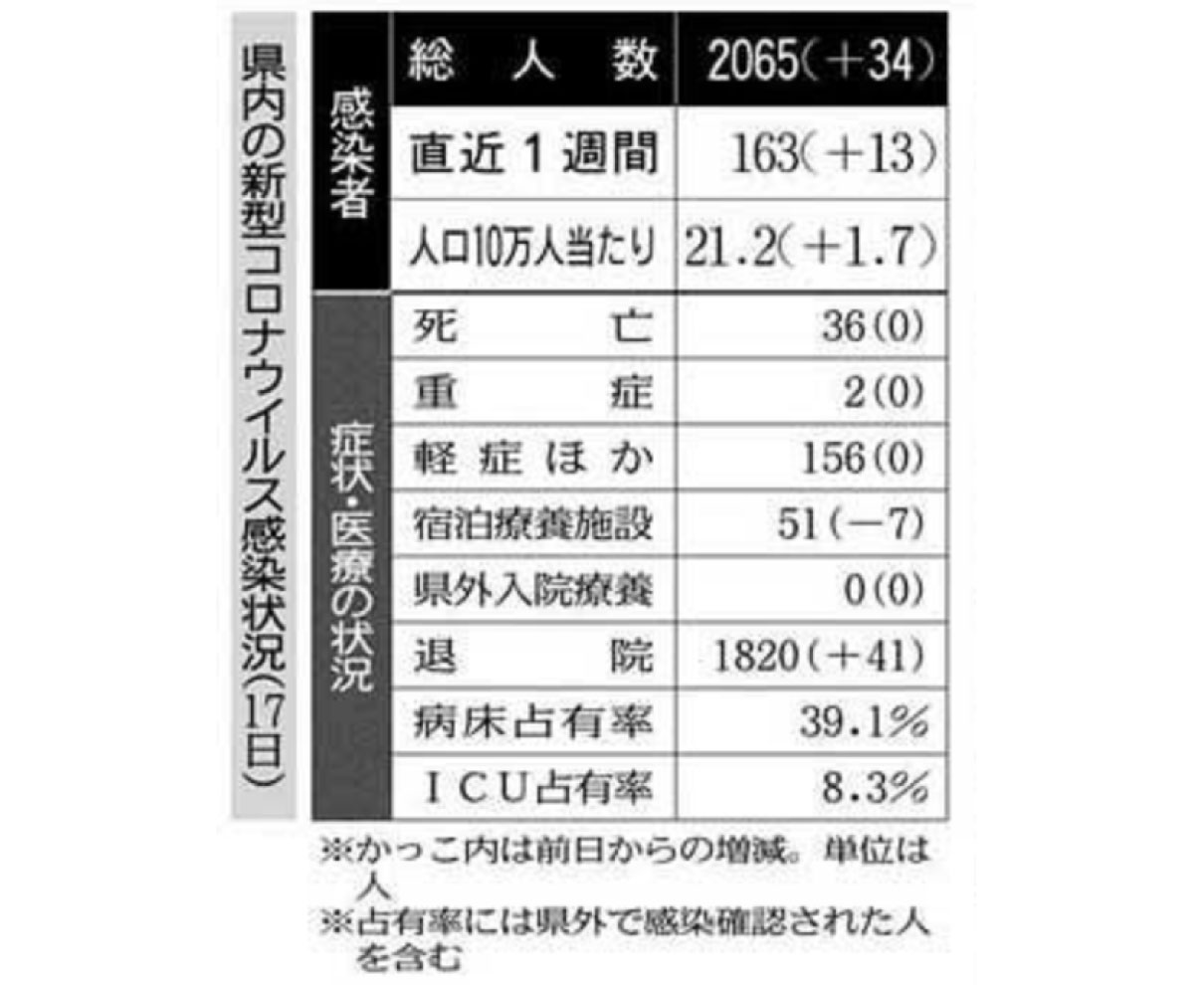 県は十七日、新たに新型コロナウイルスに三十四人が感染したと発表した。うち三人は県内で開かれている全国高校総合体育大会(インターハイ=北信越総体)サッカー競技の審判員だった。
