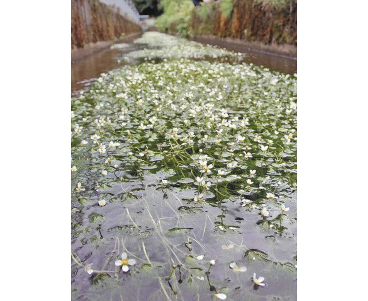 永平寺町大月の用水路で、バイカモが見頃を迎えている。地元有志が十年近く前から育てているが、今年初めて、バイカモ専用スペースを作って管理し、たくさんの花を咲かせることに成功した。