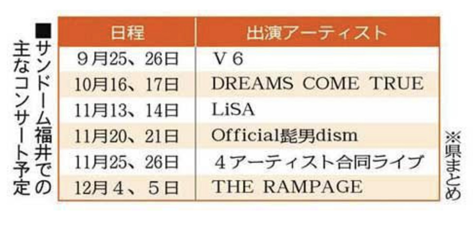サンドーム福井 大型ライブ続々 V6やドリカム 年末にかけ