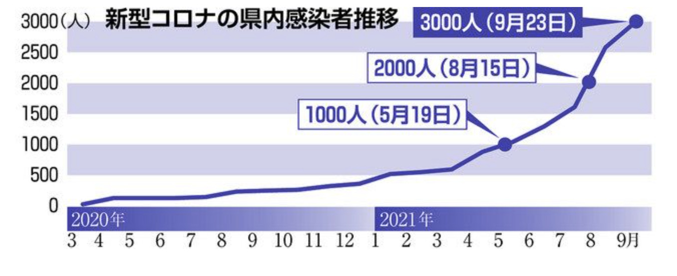 新型コロナウイルスの県内感染者の累計が二十三日、三千人となった。二千人を超えてから一カ月余りで到達した。クラスター(感染者集団)は企業や学校、福祉施設など計五十九カ所に上る。七月二十日以降の「第五波」では、感染力の強いデルタ株への置き換わりが進み、患者全体の半数を占めている。 (山本洋児)