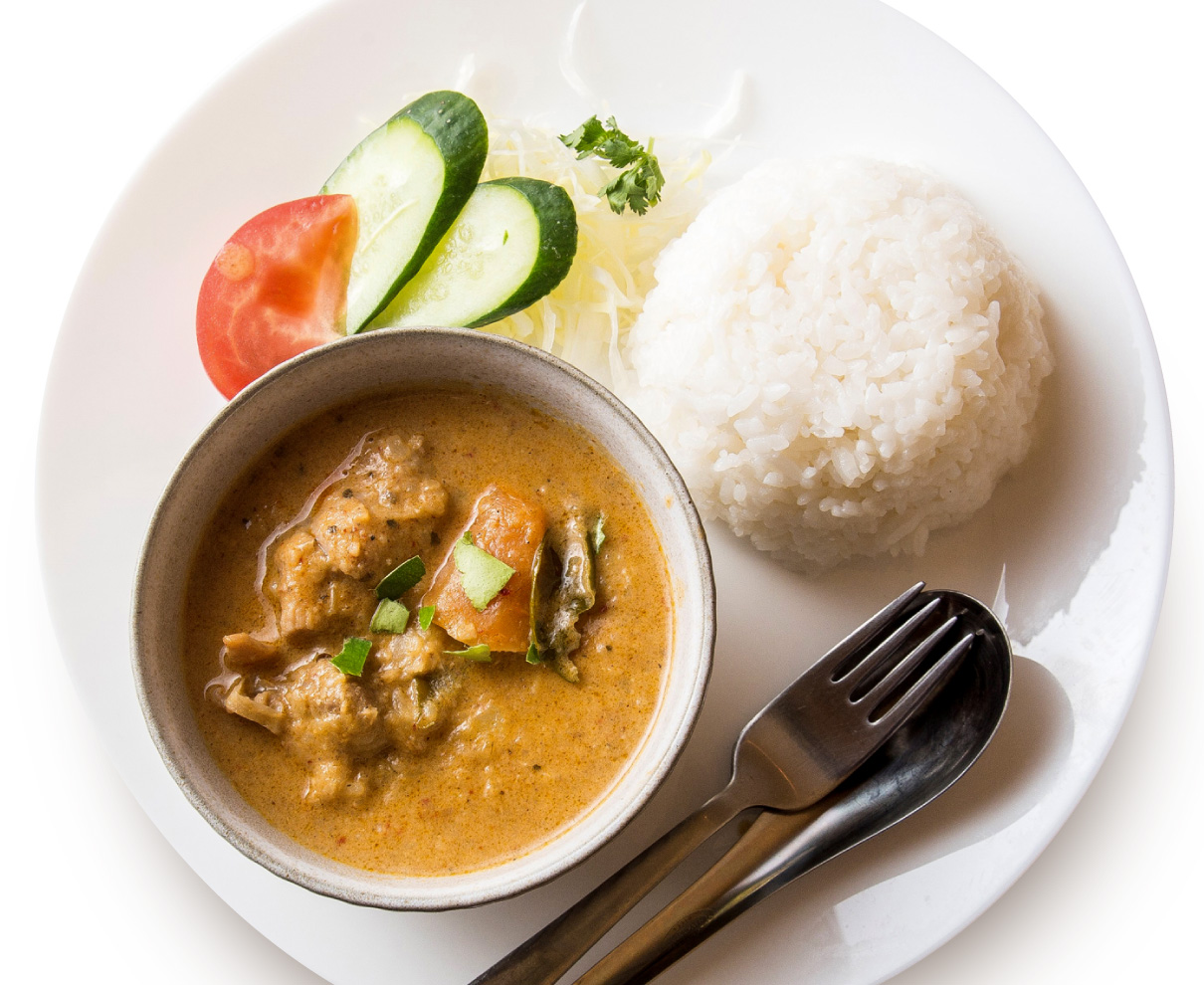 かつてアメリカの有名旅行情報サイトで、世界一美味しい料理と紹介され、一躍大人気となったタイ料理の「マッサマンカレー」。レモングラス、バイマックル、パクチーなどの数種類のハーブとスパイス、ホムデン、ピーナッツで作るペーストはもちろん自家製ココナッツミルクの風味が漂うカレーは、マイルドな辛さの中に、深いコクと上質な甘みが絡み合う、まさに本場の味だ。ガパオライスやグリーンカレーの他、アジアン&エスニック料理のテイクアウトも人気だ。