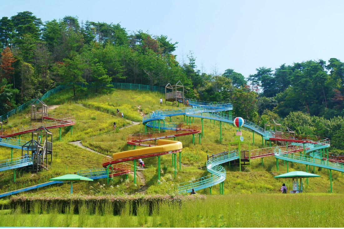 「ちびっこゲレンデ」がある「ふれあい広場」には、もう一つ大人気の遊具、総延長415メートルの「ローラー滑り台」があります。山の斜面を利用した滑り台は、グルグルと周遊するコースで、時には傾斜の具合でスピードがアップするスリルも楽しめます。小高い山から迷路のようにグネグネと伸びているので、滑りながら景色を眺められ大人も楽しめます。