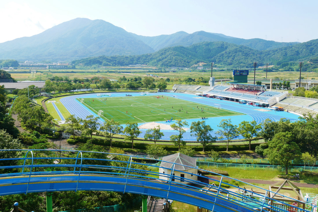 陸上競技場や体育館、テニスコート、プールなど本格的な運動施設が完備され、健康づくりに励むことができる『敦賀市総合運動公園』(利用時間や利用料金、予約などについては施設により異なります)。敷地内には「ちびっこゲレンデ」や、「ローラー滑り台」がある「ふれあい広場」のほか、入場・利用とも無料で公園のように利用できる「ちびっこ広場」もあり、大型複合アスレチックやロープで作られた山を登って遊ぶザイルクライミング、砂場などを自由に駆け回って遊ぶことができます。複合アスレチックは3つあり、子どもの年齢に応じて遊ぶことができて便利、ローラー滑り台は大人も利用でき、自然あふれる環境の中家族みんなで楽しめます。