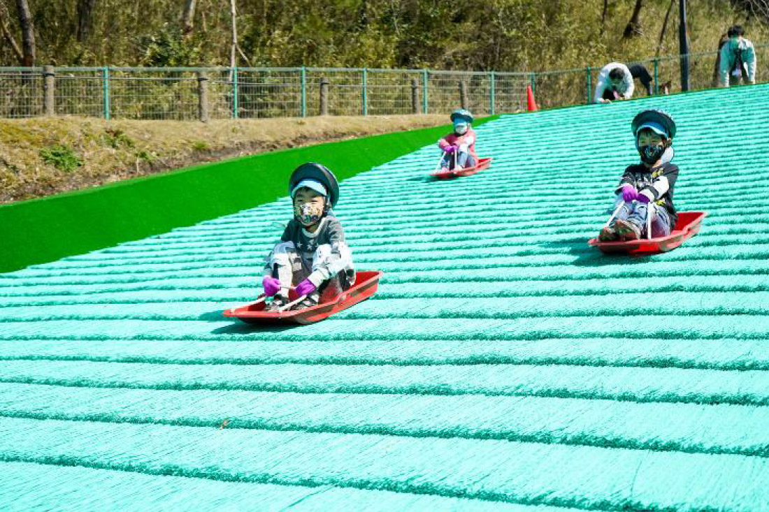 『敦賀市総合運動公園』内にある「ふれあい広場」の人工芝そり「ちびっこゲレンデ」がリニューアルし、4月にオープンしました。驚くべきはコースの長さ。初心者向けコース(小学生以下対象)は全長30メートル、上級者向けコースはなんと全長50メートルもあり、風を切ってすべる爽快感が存分に楽しめる、ちびっこも大満足のコースとなっています。