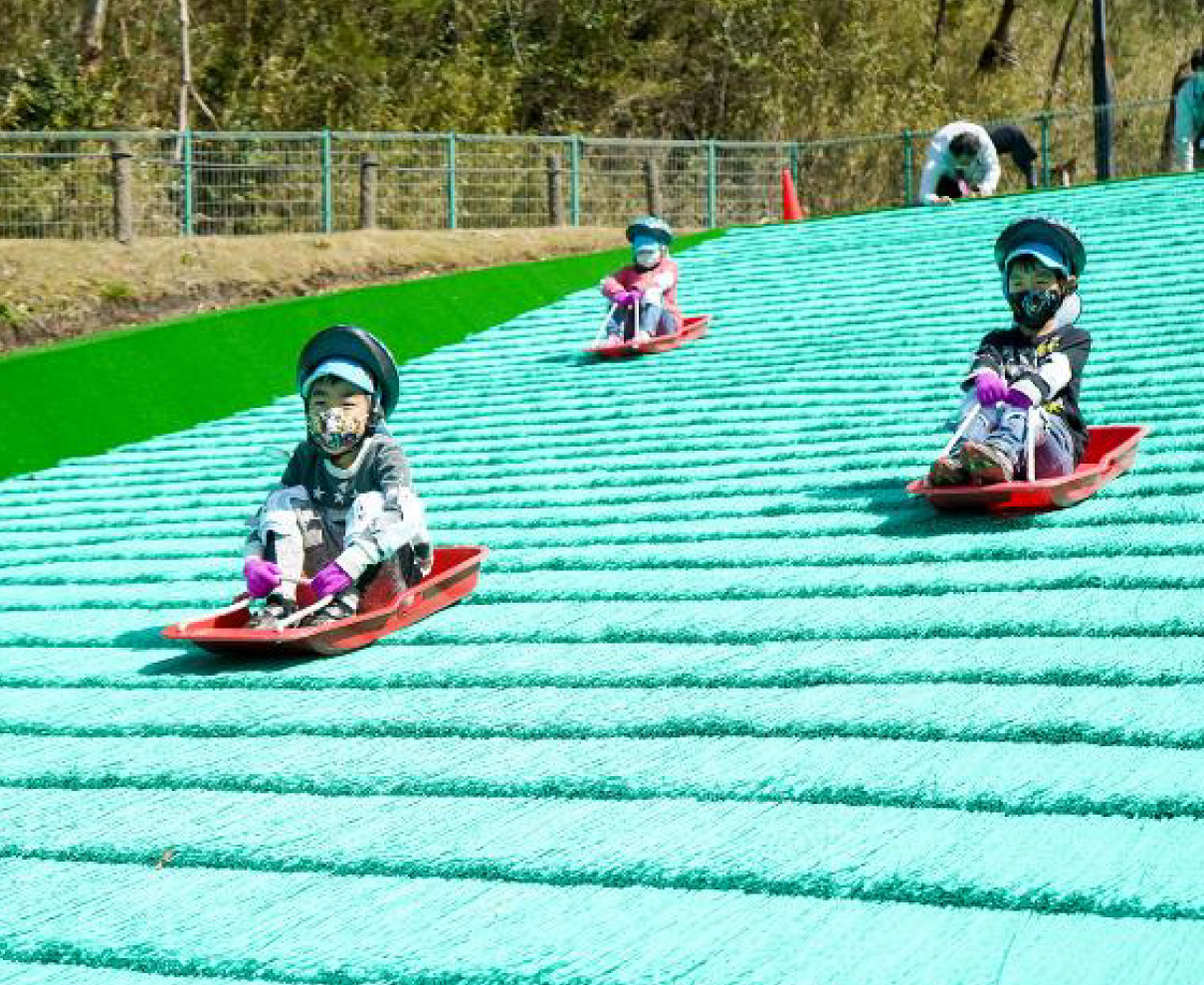 ゲレンデの頂上に立つと、一面グリーンの真新しい人工芝の景色が広がり、あまりの見晴らしの良さに攻めの姿勢を忘れるちびっ子もいるかもしれません。そんな時は初心者向けコースから慣らしていきましょう。芝そりは、転んだ時の摩擦に注意が必要なので、ソリ以外にもヘルメット、プロテクター、軍手とフル装備を貸してくれます(レンタル料は入場料込み)。「ふれあい広場」入場料100円ですべり放題なので、すべってはゲレンデを登り、すべってはゲレンデを登り――と、夢中になって遊ぶことで、きっと夜はぐっすりと眠りについてくれますよ。
