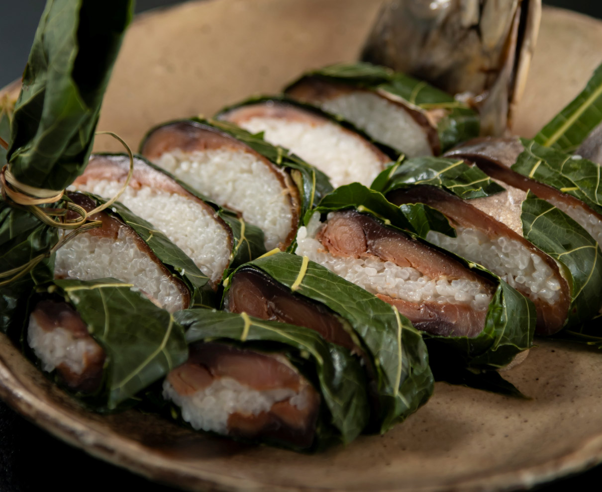 青魚を塩漬けにし、さらに糠漬けにした郷土料理・へしこもその一つで、古くから越冬の保存食として重宝されてきた珍味だが、そのへしこを使った「へしこ寿し」は河野地区独特の伝承料理。鯖のへしこをなれ寿しにしたもので、へしこを塩抜きし、三杯酢に漬けた後、炊いたご飯を挟んで、丸ごと一尾をアブラギリの葉で包み、重石をして発酵させている。小浜にも同じような「鯖のなれずし」があるが、こちらは炊いたご飯ではなく、米麹を挟み、アブラギリの葉には包まずに漬け込んでいくスタイルで、旧河野地区のものとは少々異なる。