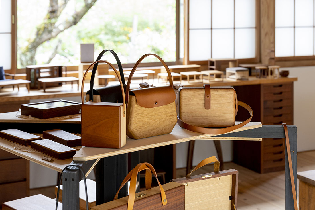 『craftman Daidai』さんには、工房に併設するショールームがあります。離れを改装した、木をふんだんに使用した空間には、オリジナル家具やリメイク家具を展示するほか、無垢材で作ったカバンや小物入れ、筆箱など、中西さんにしか作れない、柔らかな風合いに心がほっと癒される商品も展示しています。