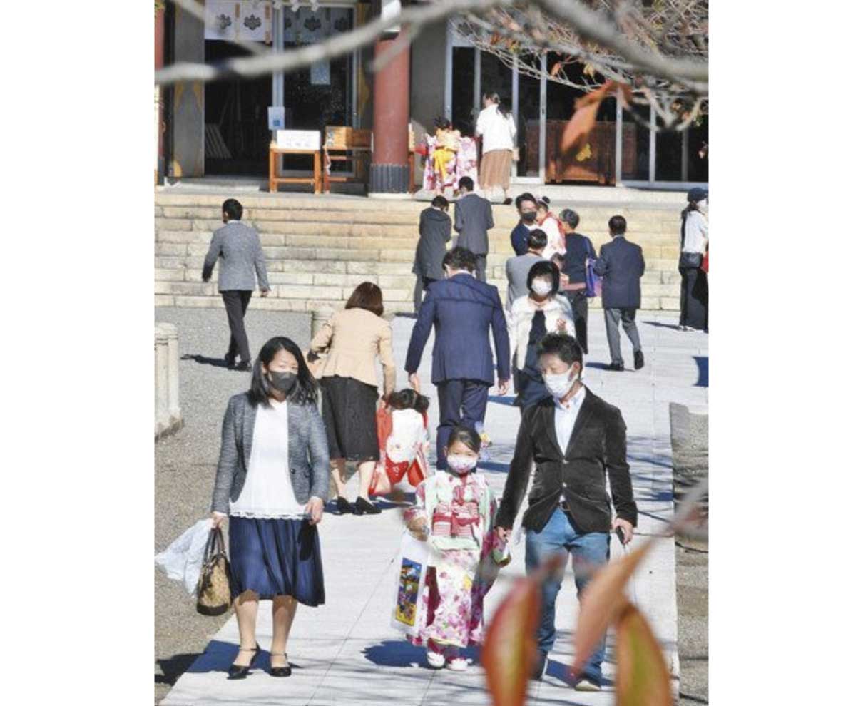 七五三参りのシーズンとなり、福井市宝永四の神明神社では好天に恵まれた七日、家族連れらが次々と訪れた。はかまや晴れ着姿の子どもたちが両親に手を引かれて行き交い、写真撮影する光景が広がった。