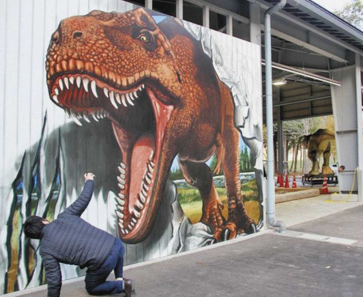 大野市和泉地区で恐竜化石が発掘されることを発信しようと市は18日、同地区にある市化石発掘体験センター「HOROSSA!(ホロッサ)」外壁面に恐竜のだまし絵を設置した。壁面を大きく飾る恐竜の絵で、フォトスポットにする。