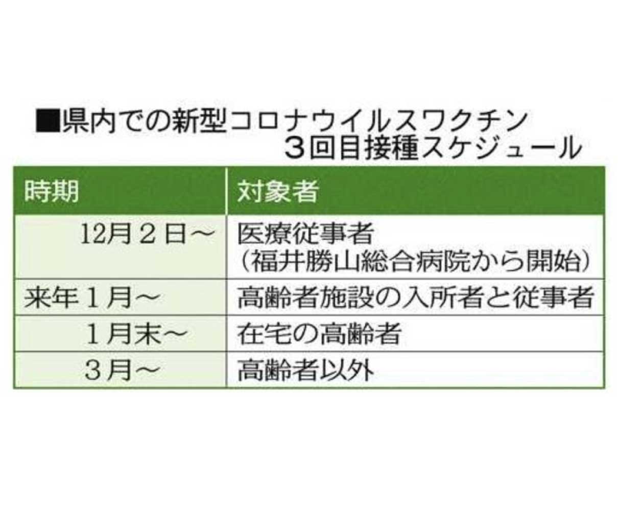 【福井】3回目接種を12月2日開始 1月から施設の高齢者 inoue 4年前 県内での新型コロナウイルスワクチンの三回目接種が十二月二日に、福井勝山総合病院(勝山市)の医療従事者から始まる。 (中日新聞福井版)続きはこちらから 日々URALAからのお知らせをLINEで受け取れます!