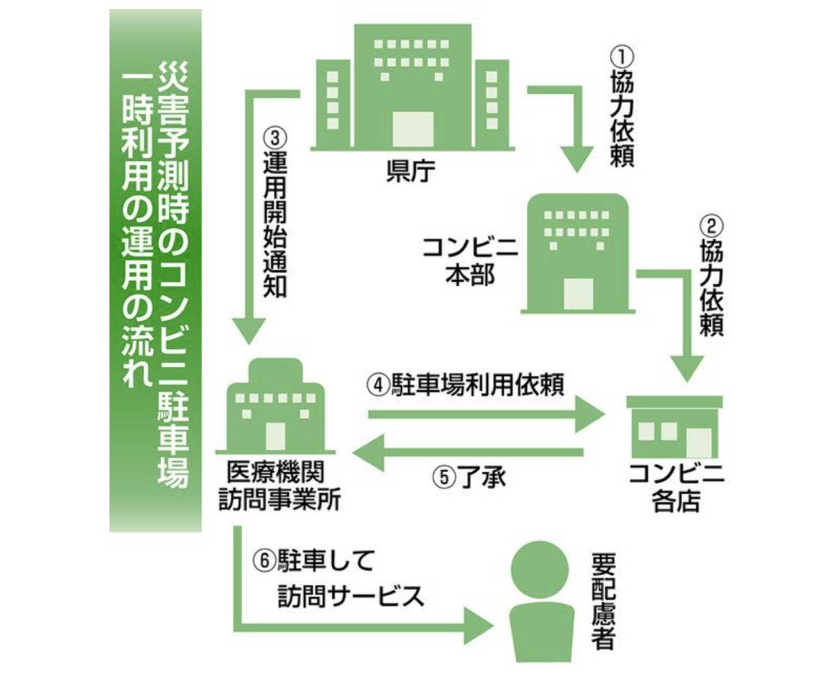 大雪をはじめとした災害時に備えて県は、訪問診療や訪問介護などの事業者がコンビニ駐車場を一時的に利用できる体制を整える。包括協定を結ぶファミリーマートと十三日から運用を始め、他のコンビニ大手にも広げる方針。在宅の要配慮者らに対するサービスを途切れさせず、県民生活の安心感を高めていく。 (山本洋児)