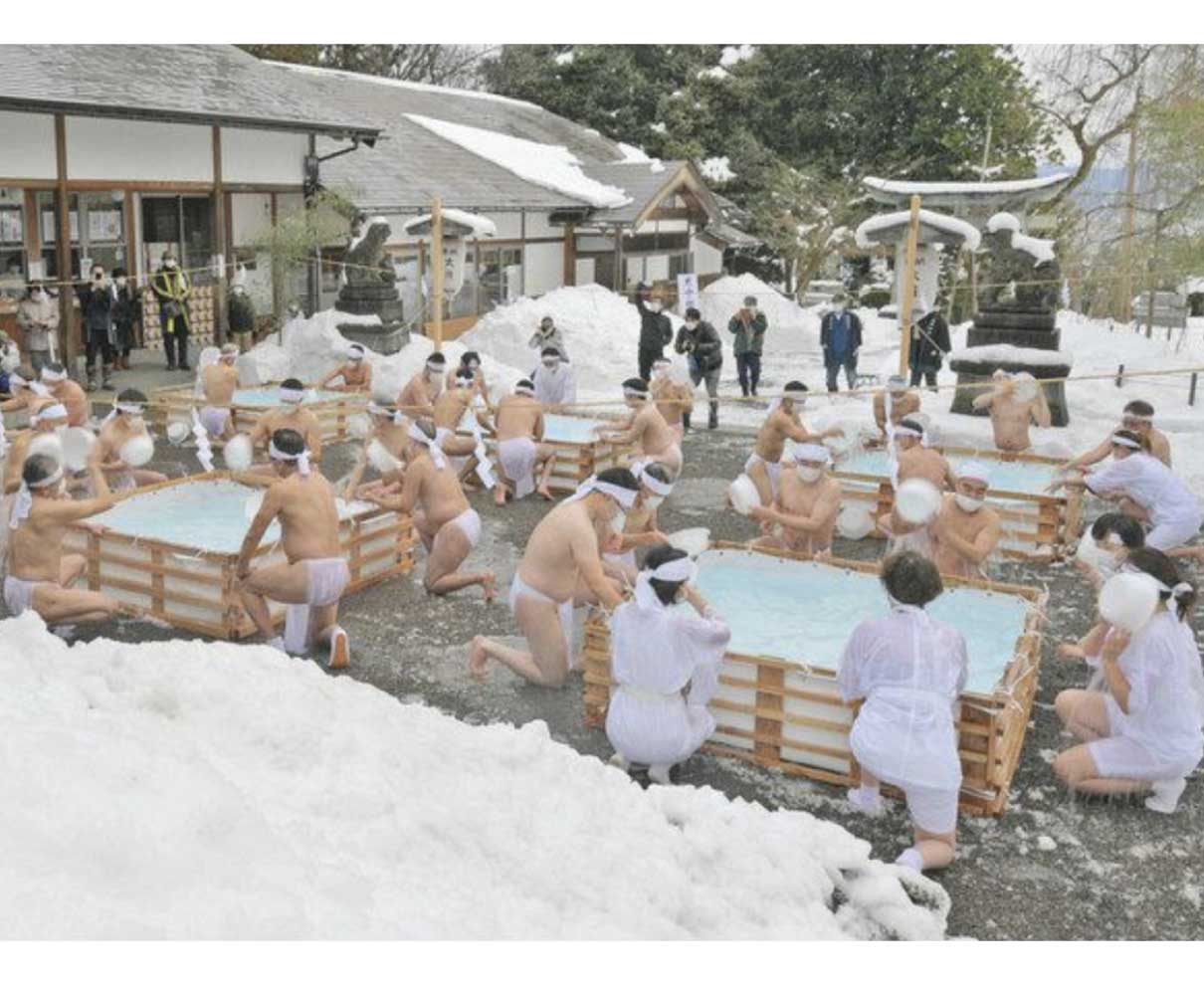 福井市の足羽神社で23日、大寒の時期恒例の寒中みそぎがあった。男女約50人がコロナ禍の早期収束などを願い、体に勢いよく冷水をかけた。