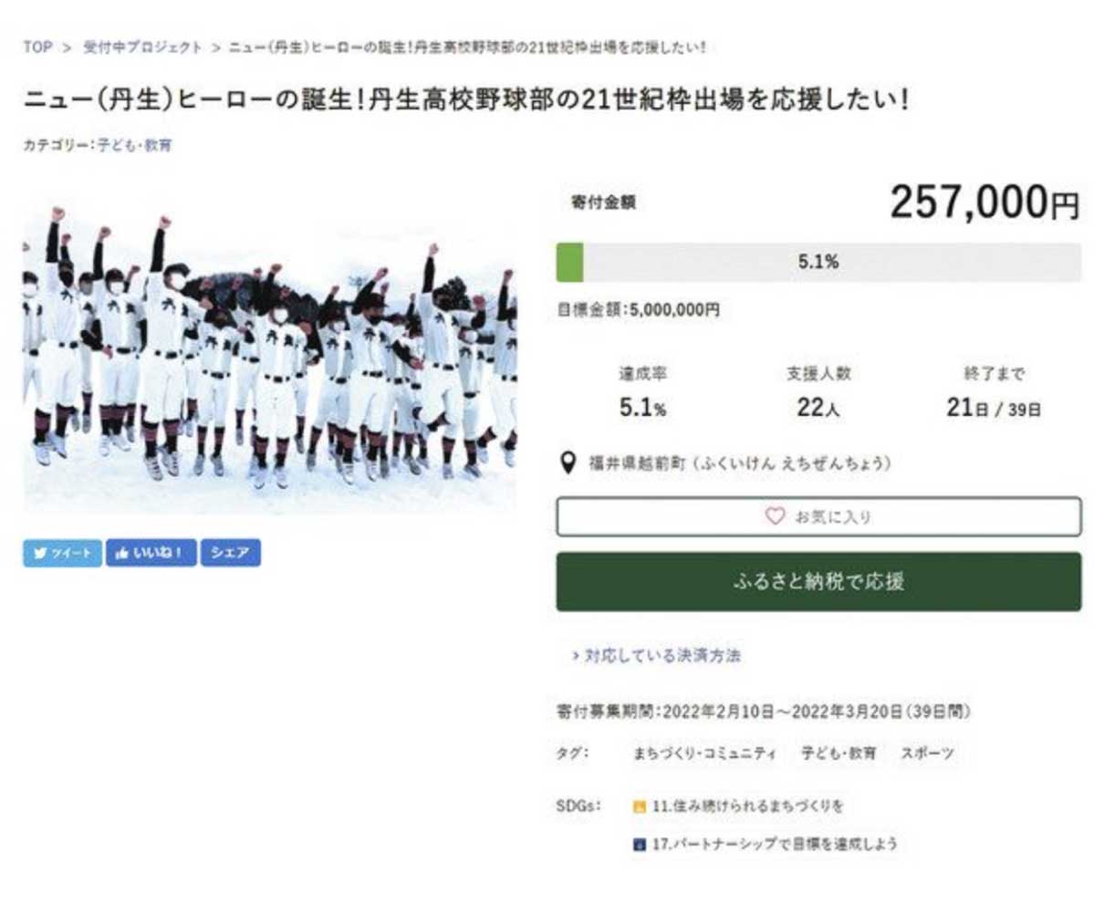 第九十四回選抜高校野球大会(三月十八日開幕)に県内初の二十一世紀枠で初出場する丹生高野球部の活動費に充てる予定の寄付金について、実行委員会と越前町それぞれの募集が想定より大幅に進んでいない。関係者は「非常に困っている。選手が不安なくプレーできるよう協力してほしい」と寄付を呼び掛けている。 (曽根智貴)