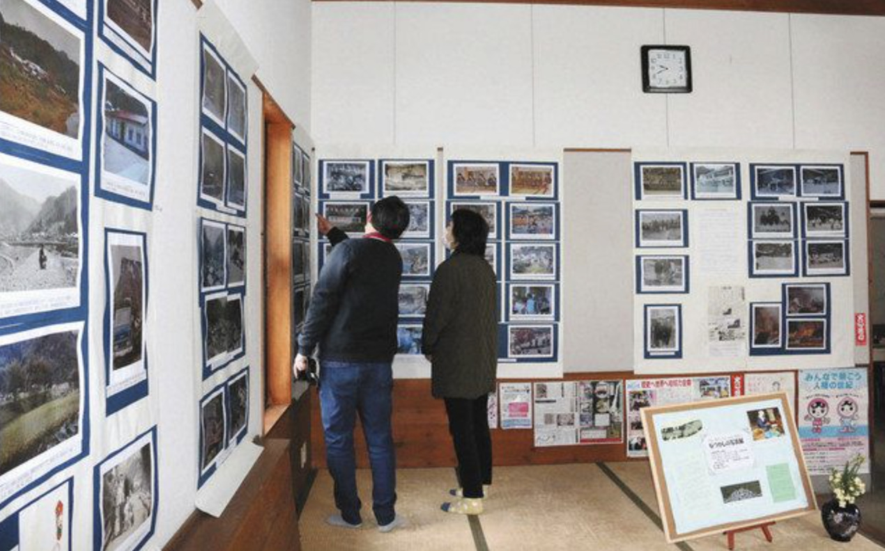 おおい町名田庄久坂地区の住民が所蔵する写真で地域の変遷を振り返る「久坂、挙野、出合、永谷、挙原のなつかしの写真展」が一日、久坂バス停待合室で始まった。一九三四(昭和九)年以降の町並みや行事などを写した三百五十点を、壁に並べたりアルバムにまとめたりして紹介。建物や風景の移ろいをたどりながら、思い出話に花が咲く展示になっている。(鈴村隆一)