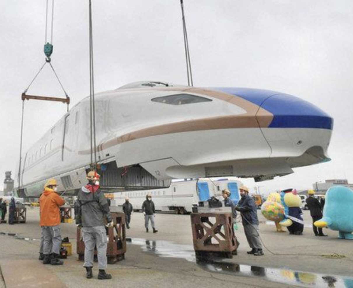 二〇二四年春の北陸新幹線敦賀開業に向け、JR西日本が新造した「W7系」の車両が一日、金沢市の金沢港に到着し、陸揚げされた。白山総合車両所(石川県白山市)での整備を経て今春の大型連休ごろにデビューし、将来的には県内区間も運行する。JR西は敦賀開業までに今回の一編成を含めて十一編成を追加投入し、全二十二編成の体制を整える。 (玉田能成)