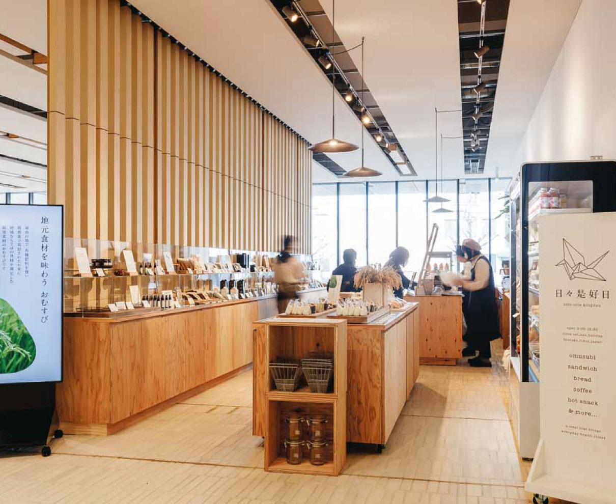 新しい庁舎になった敦賀市役所内にお店を構える『日々是好日』。「日々を健康に近づける一食」がテーマの売店では、毎日キッチンで手づくりするおむすびやサンドウィッチが大人気で、食べた瞬間、ほっこりした気分になれるのは地域の人が丁寧に育てたお米や野菜を使っているから。まるでセレクトショップのような空間には、この他にも敦賀生まれの愛らしい雑貨やお土産、敦賀の人気店の商品も取り扱っているので、お買い物気分で足を運んでみるのもいいかも。
