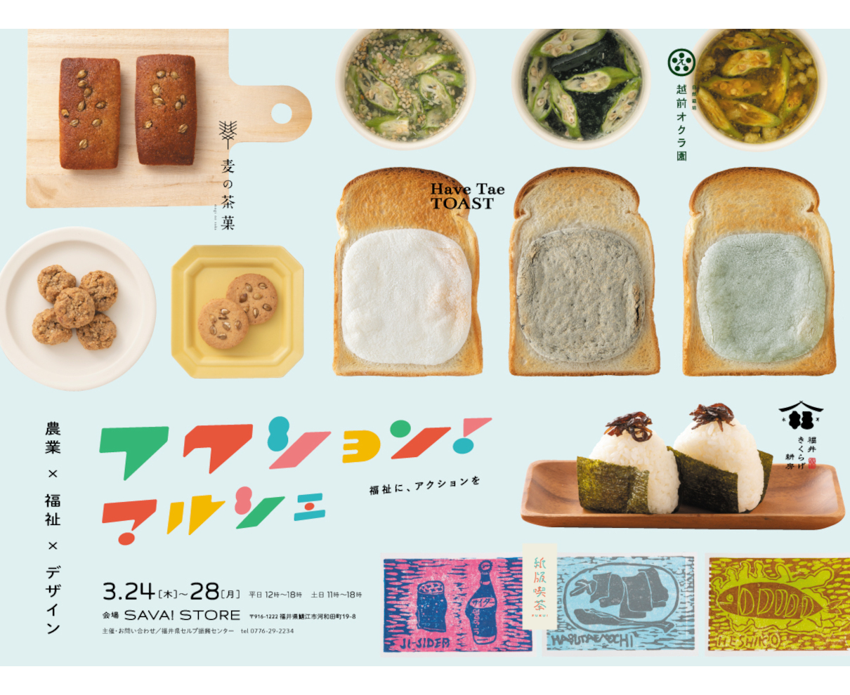 福祉分野に新たなアクションを起こしていくプロジェクト「フクション!」。このプロジェクト内で誕生した新たな商品のPOPUPイベント「フクション!マルシェ」(主催:社会福祉法人 福井県セルプ)が、鯖江市河和田のスーベニアショップ『SAVA!STORE』にて、3/24~28の期間、開催されます。