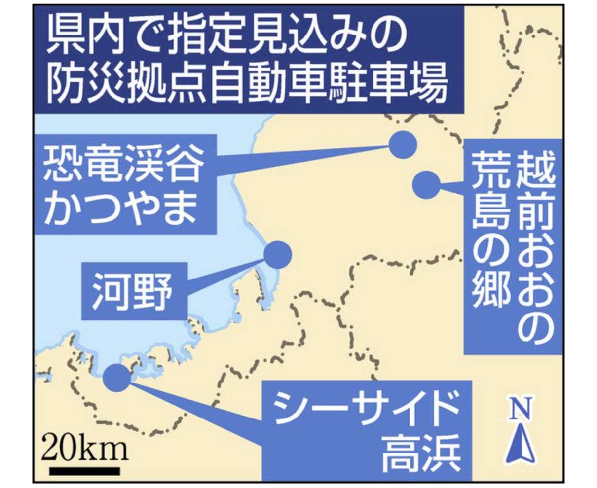 広域災害時に応急拠点となる「防災拠点自動車駐車場」の福井県関係として、国土交通省が道の駅四カ所を指定する方針を固めた。「河野」(南越前町)「シーサイド高浜」(高浜町)「越前おおの荒島の郷」(大野市)「恐竜渓谷かつやま」(勝山市)で、災害時の利用を救助、復旧活動に限定することなどが可能になる。 (山本洋児)