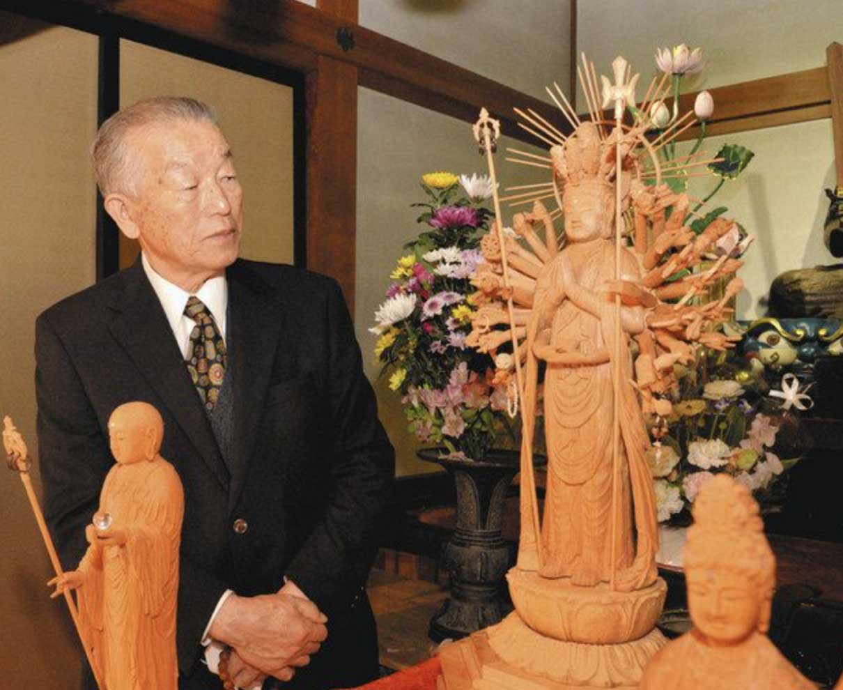 元左官業の技術を生かし五十体近くの仏像を作ってきた福井市下莇生田町の斎藤安信さん(85)が、最後に手掛けた木彫りの仏像「十一面千手観音菩薩」を同市田ノ谷町の大安禅寺に奉納した。長いコロナ禍にある世の中の安寧を願う気持ちを込めて二十七日、同寺であった開眼法要に臨んだ。
