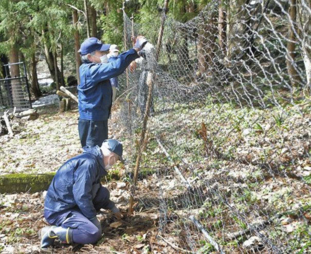 三ヘクタールに百万本と西日本最大級のカタクリの群生地を誇る大野市矢(や)の「矢ばなの里」。近年、シカが葉を食べ、花が咲きにくくなる被害が出ている。この食害からカタクリを守るため、地元住民団体「矢環境緑化実行委員会」が観賞用の遊歩道がある周囲で、対策用のネット取り付けに汗を流している。 (山内道朗)